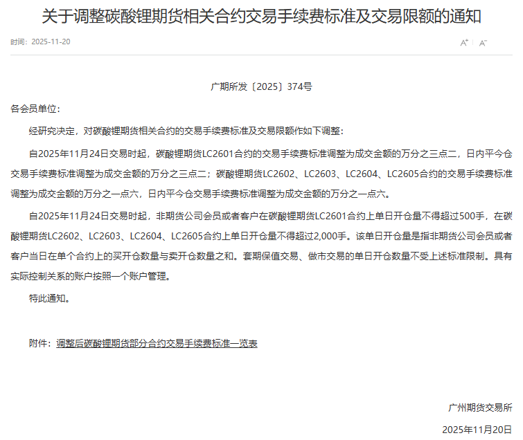 根据广期所公告,自2025年11月24日交易时起,碳酸锂期货LC2601合约的交易手续费标准将调整为成交金额的万分之三点二,日内平今仓交易手续费标准也同步调整;LC2602、LC2603、LC2604、LC2605合约的交易手续费标准则调整为成交金额的万分之一点六。在交易限额方面,非期货公司会员或客户在LC2601合约上的单日开仓量不得超过500手,在LC2602至LC2605合约上的单日开仓量则不得超过2000手。套期保值交易和做市交易的开仓数量不受上述限制。