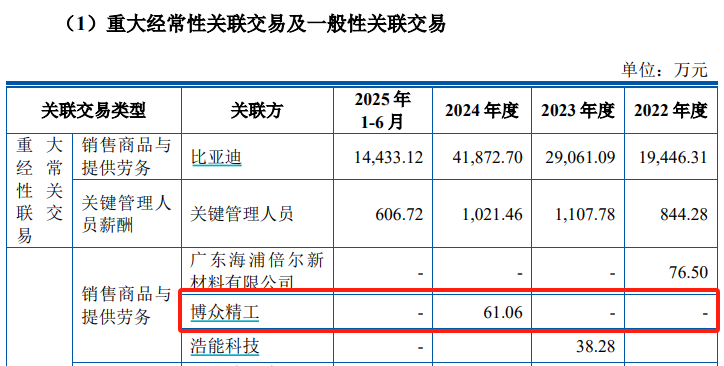 根据招股书披露,博众精工是尚水智能的关联方,后者的副董事长吕绍林担任前者的董事长兼总经理。根据招股书披露,报告期内尚水智能向博众精工进行的关联销售业务并不多,仅有2024年发生了61.06万元的销售。但据博众精工(688097.SH)发布的2024年年报披露,两家公司之间获批的交易额度高达3000万元,2024年当年发生的采购额为55.59万元,同时上一年度发生额为841.76万元。也即,博众精工确认了2023年向关联方尚水智能采购了841.76万元,但尚水智能并未认定此笔关联销售。