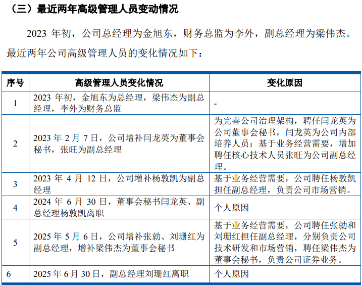 值得关注的是,在2023年到2025年冲刺IPO的期间,尚水智能的高级管理人员发生了多次变动,特别是2023年2月7日为完善公司治理架构,聘任闫龙英为公司董事会秘书;而在一年之后的2024年6月闫龙英便宣告离职,直至2025年5月6日聘任梁伟杰为董事会秘书,负责公司证券业务。还有2025年2月才入职尚水智能的刘珊红,2025年5月被任命为公司副总经理,仅一个多月后便因个人原因提出离职。