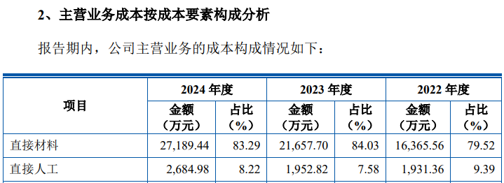 另据公开信息披露显示,公司的生产人员人数在2024年为305人,相比上年度的311人还出现了减少,安装调试工时也小幅减少;但与此同时,2024年主营业务成本中的直接人工金额为2684.98万元,相比2023年的1952.82万元大幅增加了30%以上。与此形成对照的是2023年生产人员人数相比2022年大增了约三分之二、安装调试工时几乎翻倍的背景下,2023年的直接人工成本相比2022年却并无多少增加,深圳咖啡交流群对此,尚水智能并未回应记者的采访。