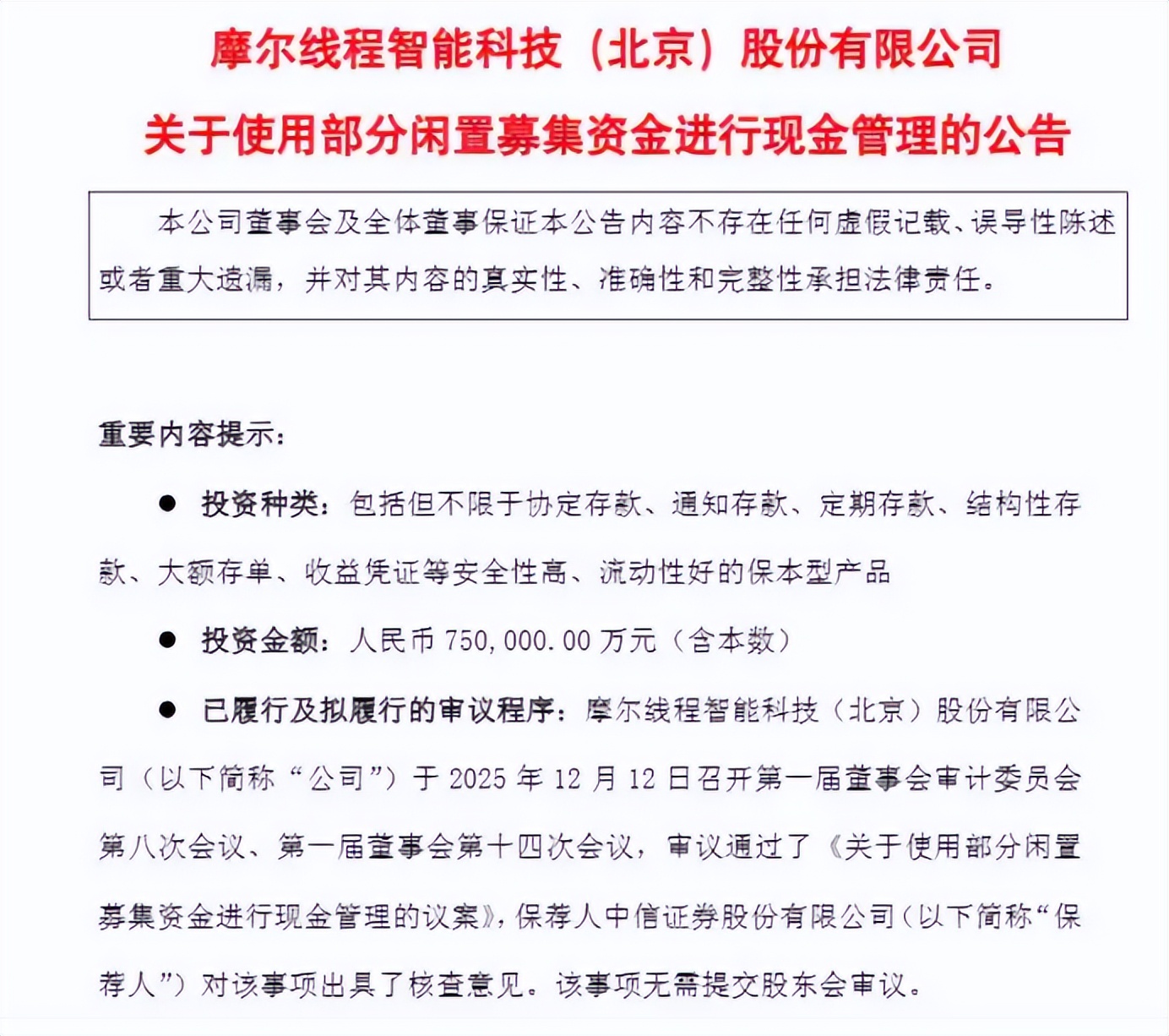 此公告迅速引发部分投资者质疑,被解读为“前脚募资80亿,后脚就拿75亿去理财”,市场担忧其募投项目投入可能不及预期。对此,摩尔线程相关负责人回应称,本次审议的75亿元是现金管理额度的上限,实际使用金额将明显小于该数字。公司强调,随着募投项目推进及置换前期自有资金投入,闲置资金规模和现金管理额度都将动态下降,绝不会因此影响主营业务发展与募投项目的正常实施。