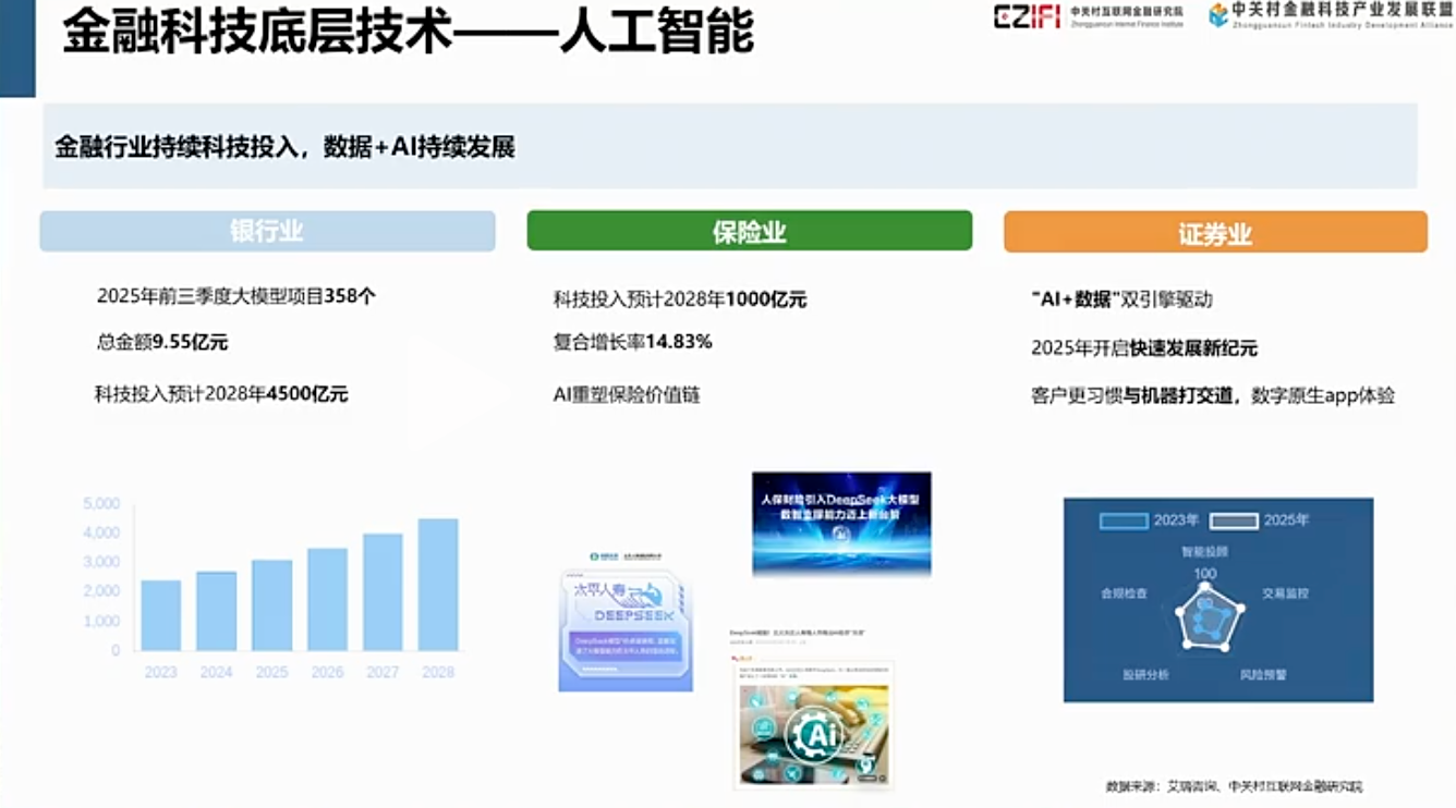 与此同时,中国金融科技市场快速发展。从技术层面来看,一方面,人工智能增速迅猛。据《报告》,中国AI市场2019年至2024年市场规模复合年增长率达41.9%,预计2029年市场规模为2.9万亿元。2025年前三季度,银行业大模型项目达到358个,总金额9.55亿元,科技投入预计2028年达到4500亿元。