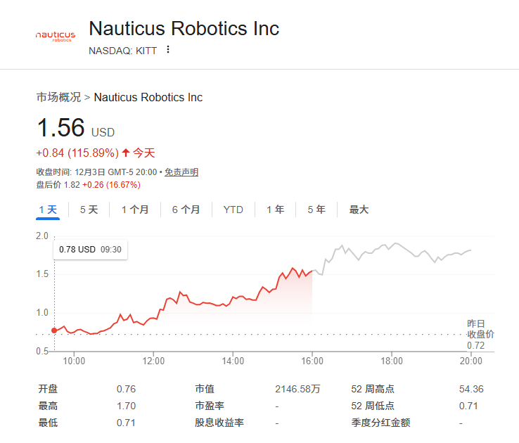 【环球网财经综合报道】当地时间周三,美股交易时段,机器人板块成为市场焦点,多只概念股强势上扬。截至收盘,海洋机器人公司Nauticus Robotics股价暴涨超过115%,家用机器人制造商iRobot涨幅亦高达73%。市场普遍认为菲律宾退群事件视频曝光,此次板块行情与市场对美国即将出台机器人产业扶持政策的预期密切相关。