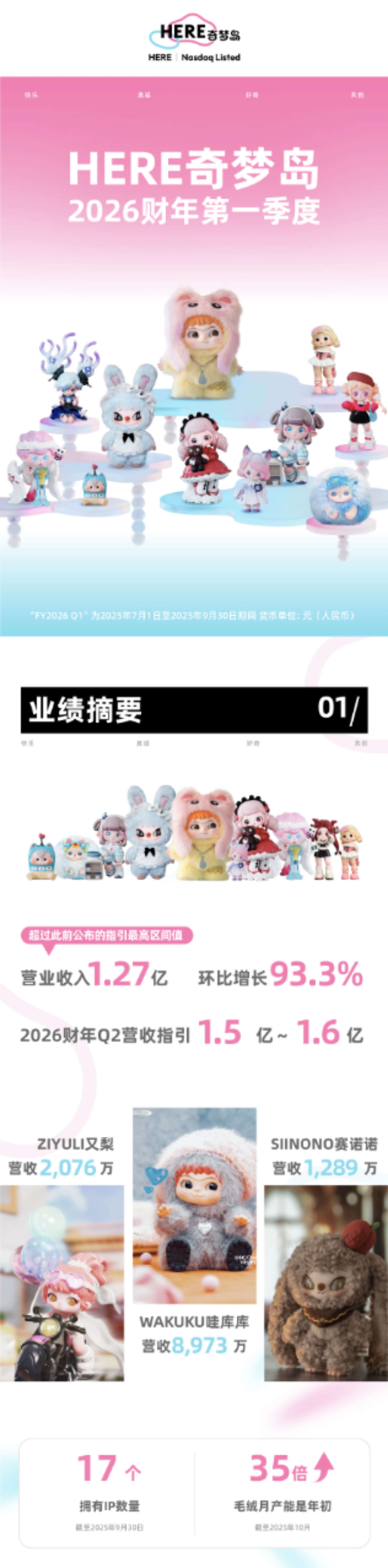 财报显示,本财季奇梦岛实现潮玩业务总营收1.271亿元,环比激增93.3%,远超1至1.1亿元的业绩指引区间上限。2026财年Q2营收指引为1.5亿—1.6亿元。