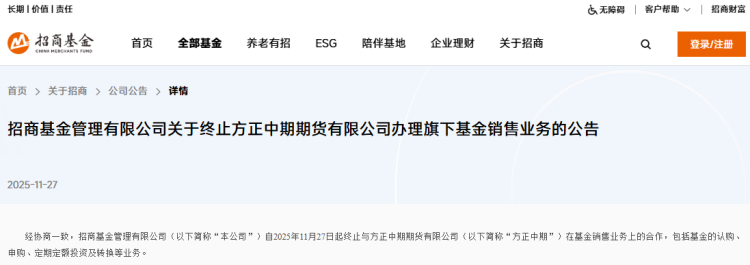 另一边,招商基金与“方正中期”的“分手”则揭示了另一类机构的退出路径。公告显示,双方合作已于11月27日终止。今年以来,海富通、天弘、交银施罗德等多家基金公司也已陆续与方正中期终止合作。